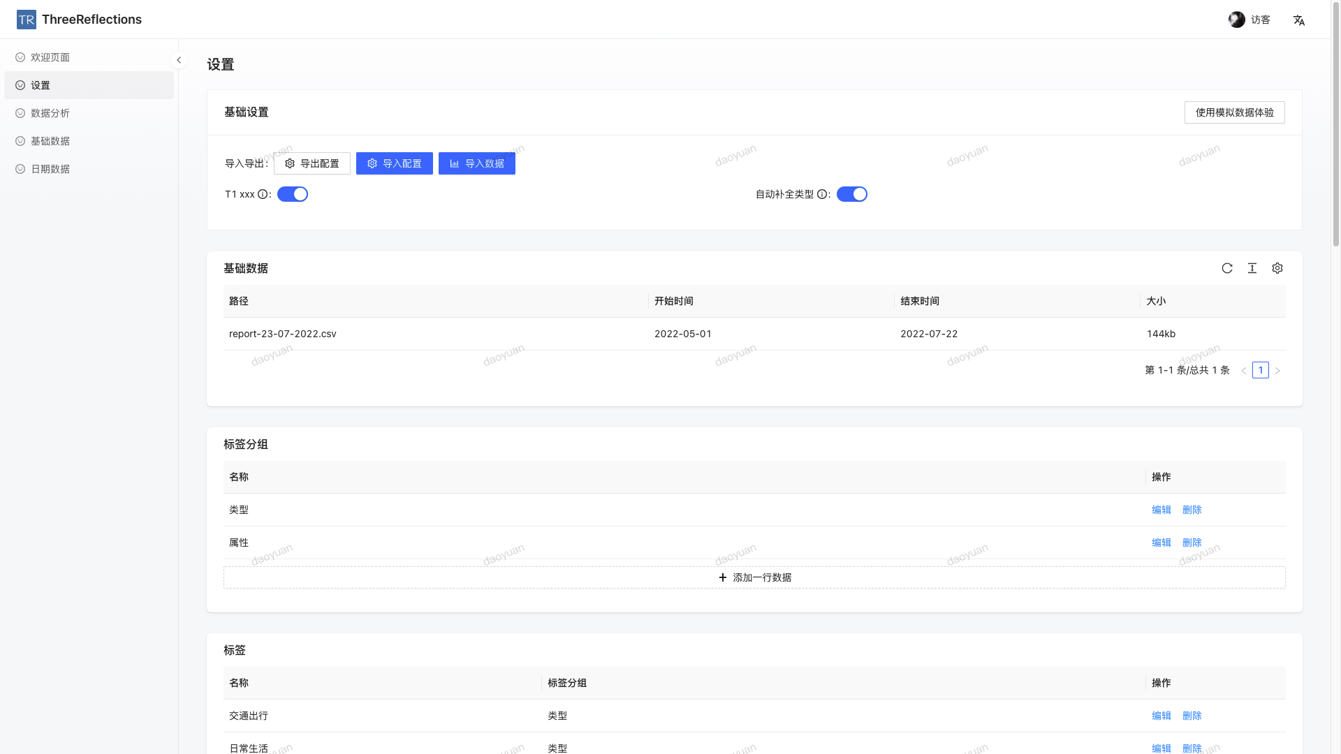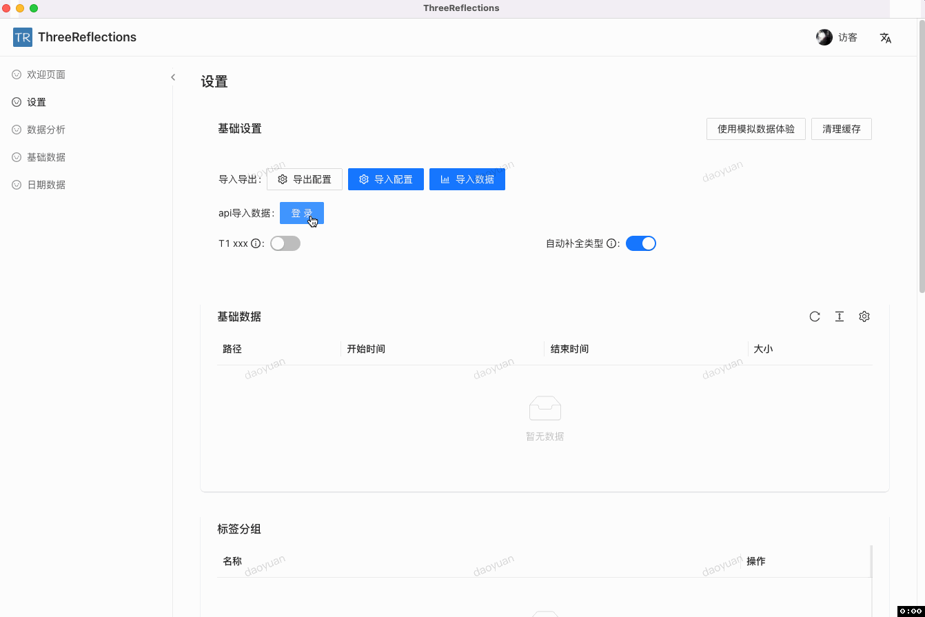 在设置页面=>基础设置卡片里点击使用模拟数据体验,可以快速体验软件功能
